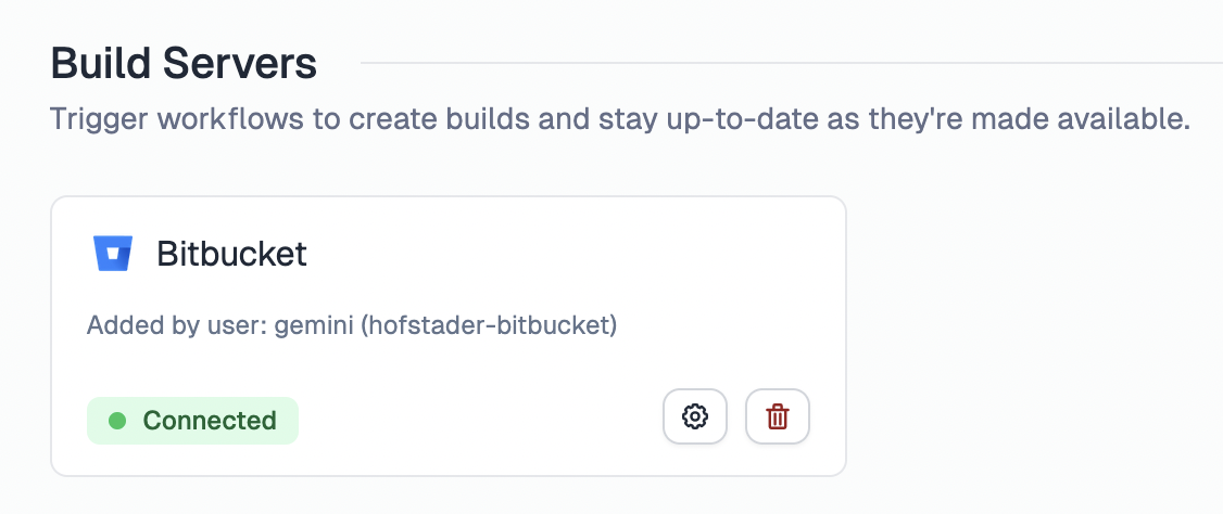 Navigate to the integrations page for your app and select Bitbucket under the Build Servers section.