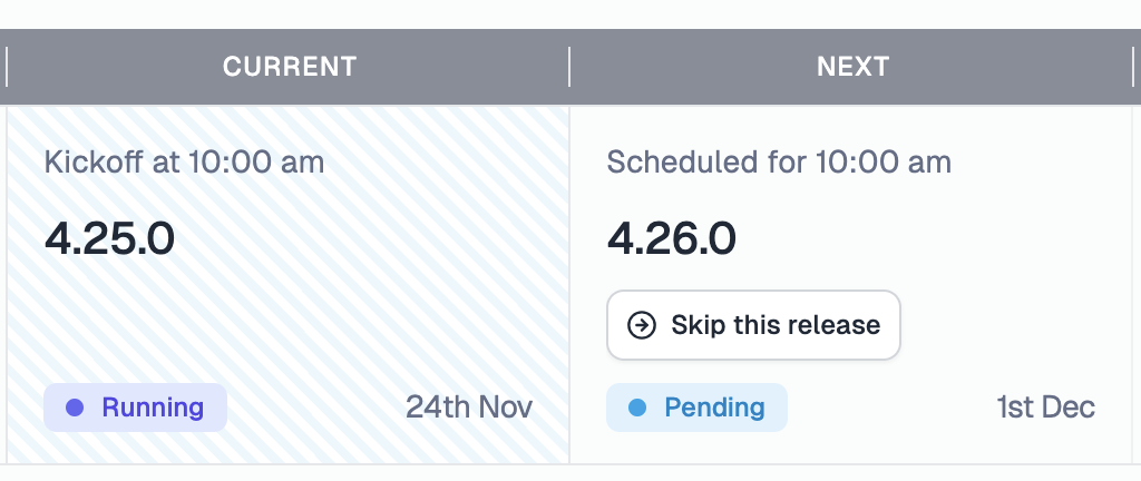 If you need to skip the next scheduled release, you can do so by clicking the Skip this release button on the calendar view of your release dashboard.